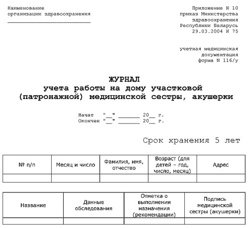 4. Патронаж осуществляется с обязательным заполнением учетно-отчетной документации: патронажного листа (см. Приложение 1), который вклеивается в амбулаторную карту (ф.025/у), журнала учета работы на дому участковой (патронажной) медицинской сестры (см. Приложение 2) (ф.116/у).