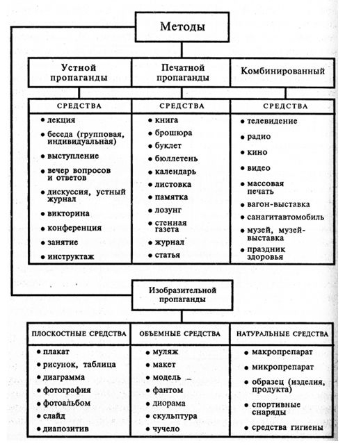 Метод устной пропаганды занимает ведущее место в деятельности медицинских работников. Он позволяет установить непосредственный контакт со слушателями, изложить значительный по объему материал большой аудитории и быстро реагировать на события. Наиболее распространенные средства метода устной пропаганды — лекции, беседы, доклады, вечера вопросов и ответов, викторины, консультации, краткие выступления, групповые профилактические приемы, тематические вечера, курсовое обучение. Каждое из этих средств имеет свои особенности.
